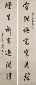 编号:10446 作者:溥杰 名称:行书七言联 规格:20*89cm*2 形式:纸本镜心 售价:¥9800 备注: