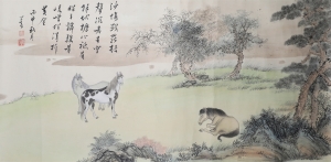 编号:10549 作者:马晋 名称:戏马图 规格:18*46cm 形式:纸本竹骨 售价:¥25000 备注:背面孔寿山书法