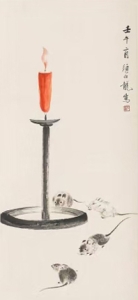 编号:10602 作者:颜伯龙 名称:灯鼠图 规格:67×30.5cm 形式:纸本立轴 售价:¥12000 备注: