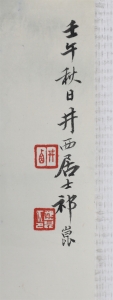 祁井西(又名祁昆1901—1944)字景西,号井西居士斋号曰松崖精舍。北京人。初以籹卖颜色得识京城名家,刻励自学。因受民初追踪宋元之风的影响,专意摹古临古,尚北宗山水,所画理法精严,笔墨精致,枯润合度。在20-40年代的北京有一定影响。工细山水得明人遗意,又精篆刻。性喜犬,室内床上下所蓄犬无思十余头,可谓奇癖,所作山水,规模明人,而近于王翚。作风精细清润,构图全出之正统派民国初年北京画坛以王翚为“神圣不可侵犯”,祁氏亦受影响,在学王诸诸家中堪称翘楚。但用笔略嫌拘谨板实,工稳有余,创意不足。弟子有郭传璋徐鼎正梁树年等。