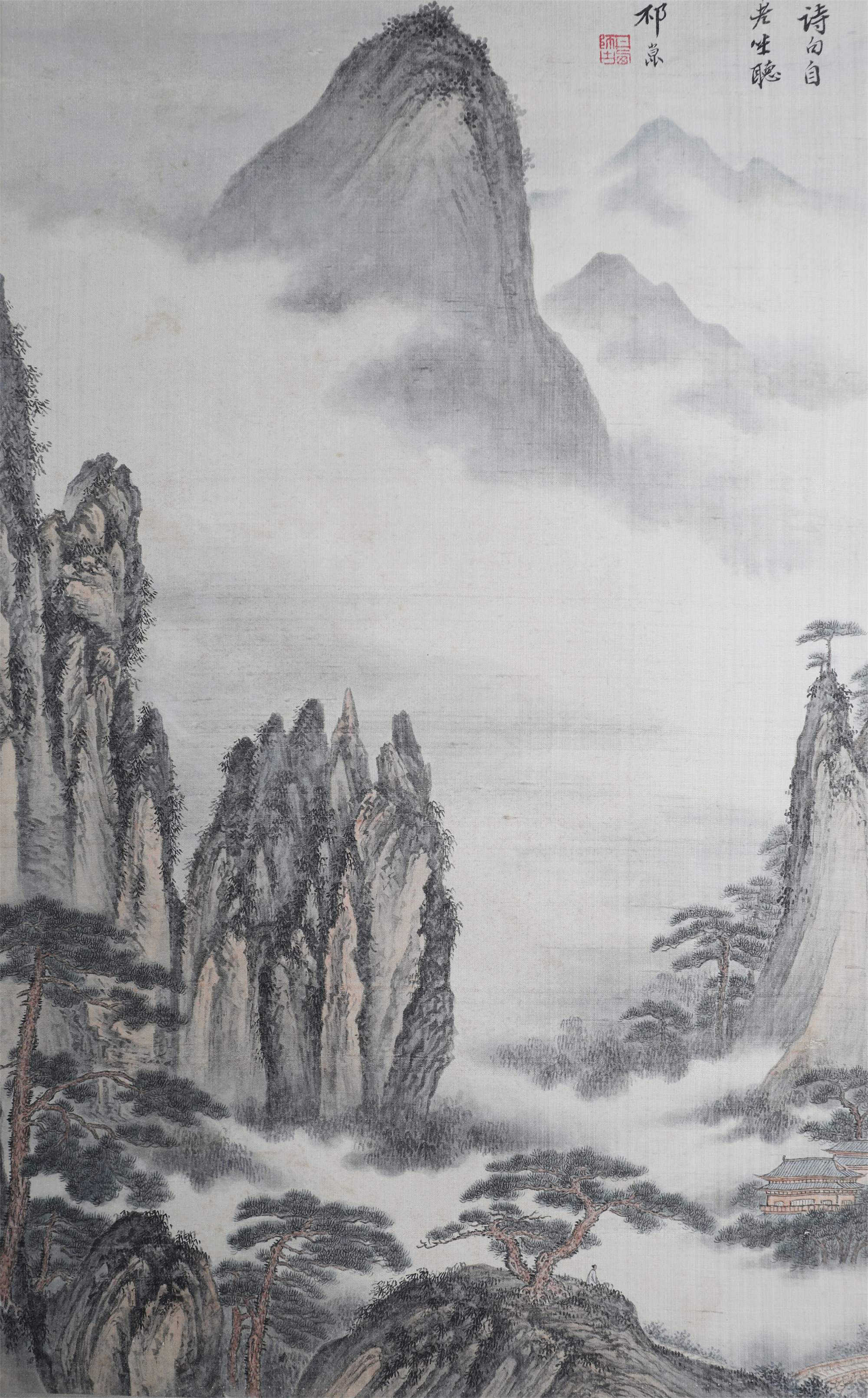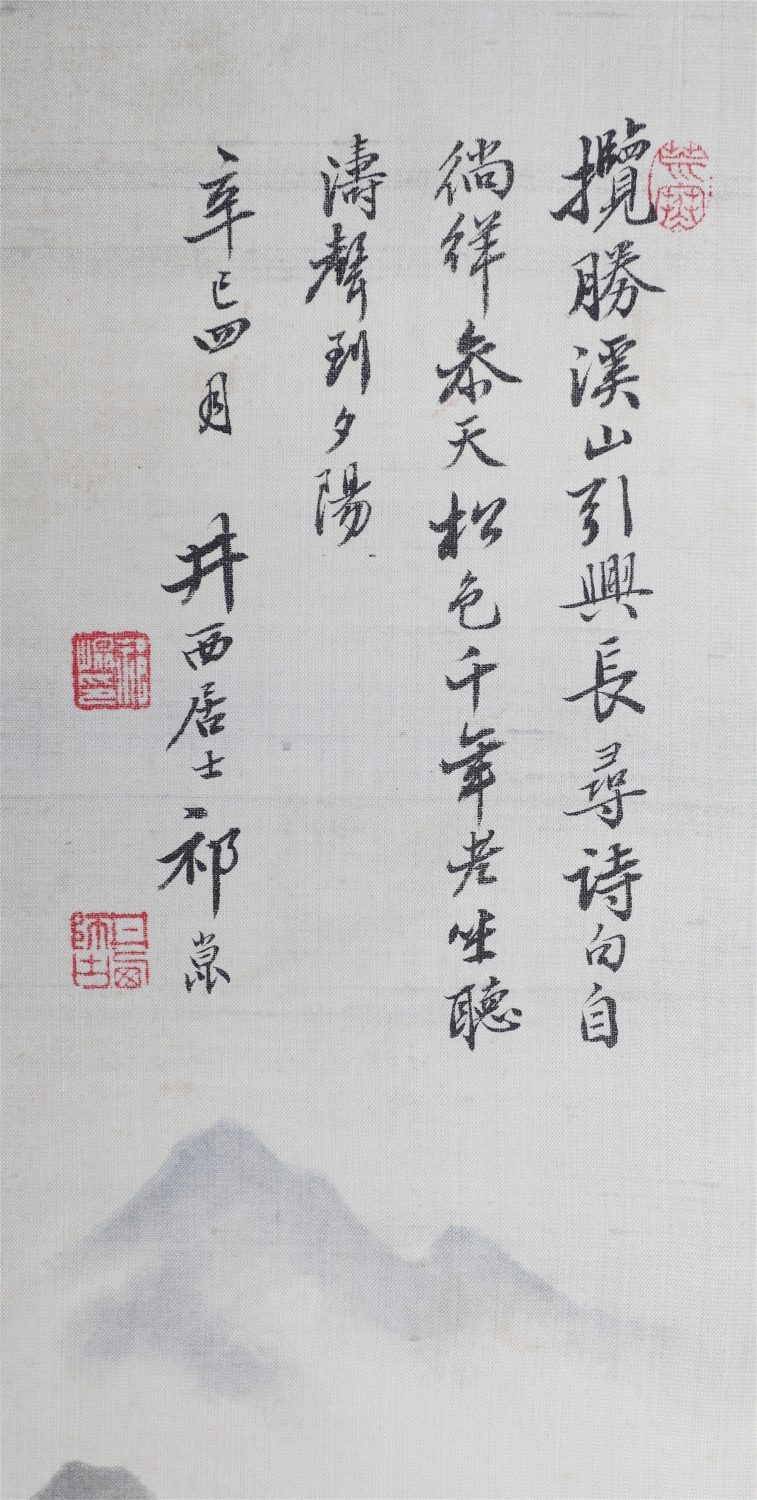 祁井西(又名祁昆1901—1944)字景西,号井西居士,斋号曰松崖精舍。北京人。初以籹卖颜色得识京城名家,刻励自学。因受民初追踪宋元之风的影响,专意摹古临古,尚北宗山水,所画理法精严,笔墨精致,枯润合度。在20-40年代的北京有一定影响。工细山水得明人遗意,又精篆刻。性喜犬,室内床上下所蓄犬无思十余头,可谓奇癖,所作山水,规模明人,而近于王翚。作风精细清润,构图全出之正统派民国初年北京画坛以王翚为“神圣不可侵犯”,祁氏亦受影响,在学王诸诸家中堪称翘楚。但用笔略嫌拘谨板实,工稳有余,创意不足。弟子有郭传璋、徐鼎正、梁树年等。