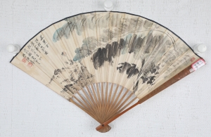 编号:11156 作者:祁井西 名称:山水 规格:15*51cm 形式:纸本竹骨成扇 售价:¥38000 备注: