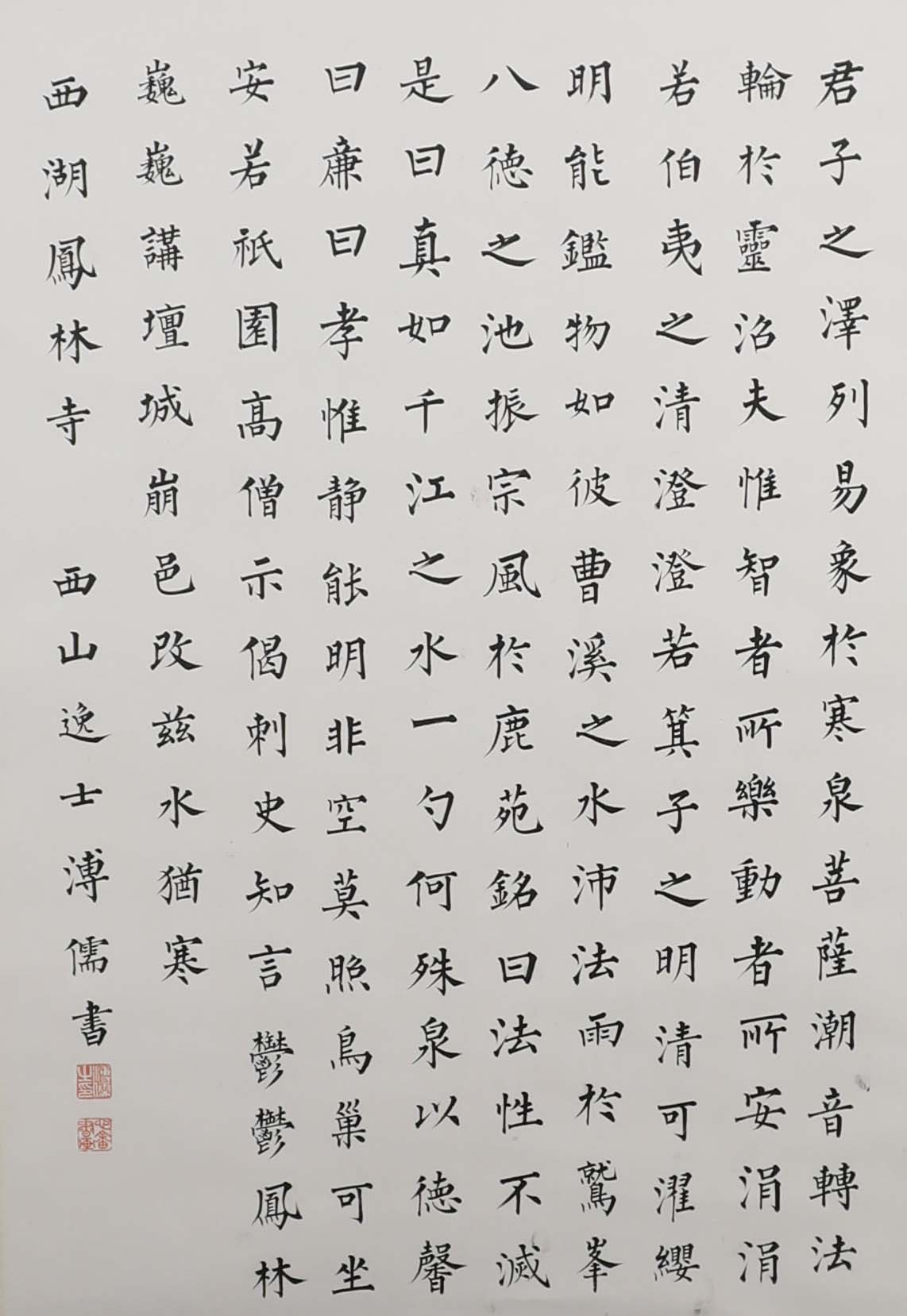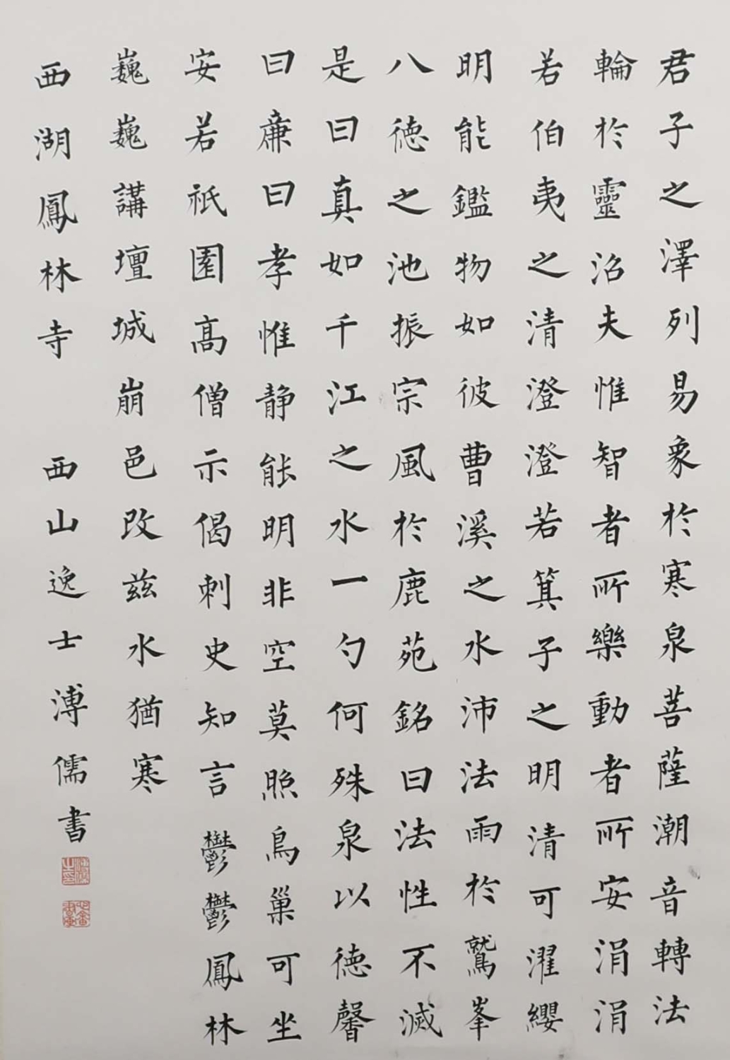 释文:君子之泽,列易象于寒泉。菩萨潮音,转法轮于灵沼。夫惟智者所乐,动者所安。涓涓若伯夷之清,澄澄若箕子之明。清可濯缨,明能鉴物,如彼曹溪之水,沛法雨于鹫峰,八德之池,振宗风于鹿苑。铭曰:法性不灭,是曰真如。千江之水,一勺何殊。泉以德馨,曰廉曰孝。惟静能明,非空莫照。鸟巢可坐,安若祇园。高僧示偈,刺史知言。郁郁凤林,巍巍讲坛。城崩邑改,兹水犹寒。