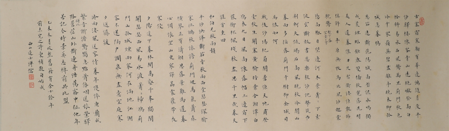 溥心畬[yú],满族,原名爱新觉罗·溥儒,初字仲衡,改字心畬,自号羲皇上人、西山逸士,北京人,著名书画家、收藏家。为清恭亲王奕訢之孙。曾留学德国,笃嗜诗文、书画,皆有成就。画工山水、兼擅人物、花卉及书法,与张大千有“南张北溥”之誉,又与吴湖帆并称“南吴北溥”。