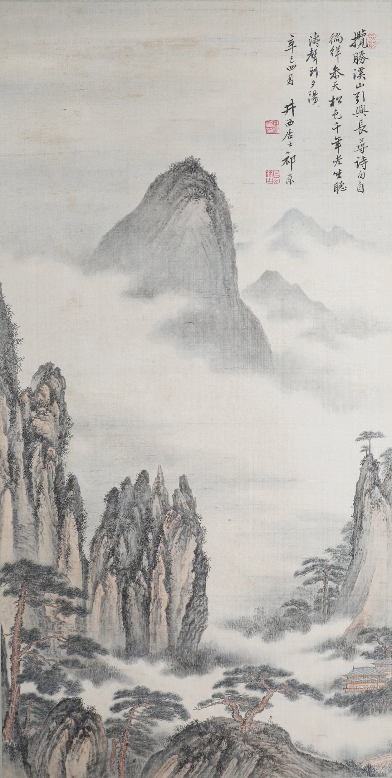 祁井西(又名祁昆1901—1944)字景西,号井西居士,斋号曰松崖精舍。北京人。初以籹卖颜色得识京城名家,刻励自学。因受民初追踪宋元之风的影响,专意摹古临古,尚北宗山水,所画理法精严,笔墨精致,枯润合度。在20-40年代的北京有一定影响。工细山水得明人遗意,又精篆刻。性喜犬,室内床上下所蓄犬无思十余头,可谓奇癖,所作山水,规模明人,而近于王翚。作风精细清润,构图全出之正统派民国初年北京画坛以王翚为“神圣不可侵犯”,祁氏亦受影响,在学王诸诸家中堪称翘楚。但用笔略嫌拘谨板实,工稳有余,创意不足。弟子有郭传璋、徐鼎正、梁树年等。